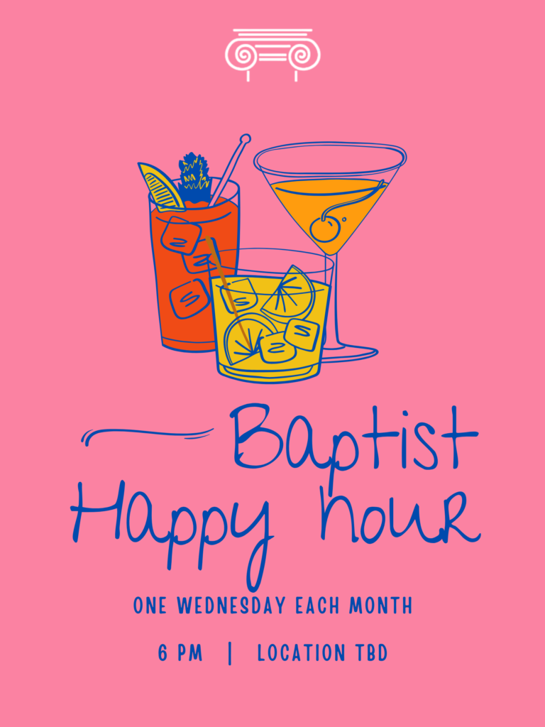Baptist Happy Hour encourages participants to not only share food and drinks, but their own stories of God’s work in their lives. If you are interested in the Baptist Happy Hour or would like more information regarding additional formation opportunities, contact us.